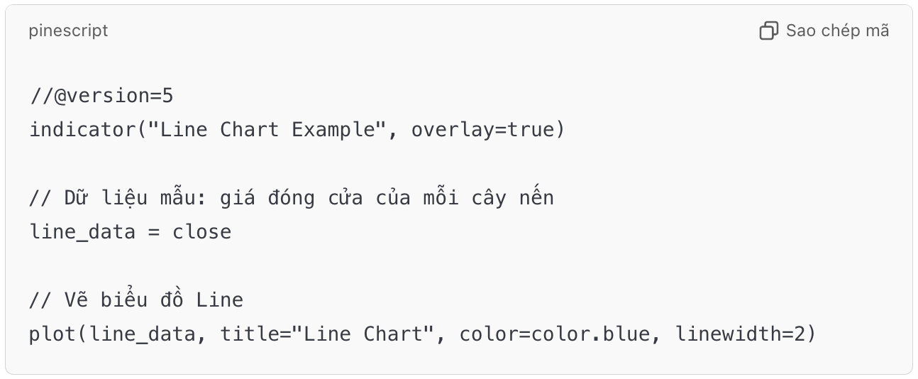 Biểu đồ Line trong TradingView được sử dụng để vẽ các đường nối các điểm giá trị liên tiếp, giúp theo dõi sự thay đổi theo giá thời gian. Bạn có thể sử dụng hàm plot() trong Pine Script để vẽ biểu đồ Line.