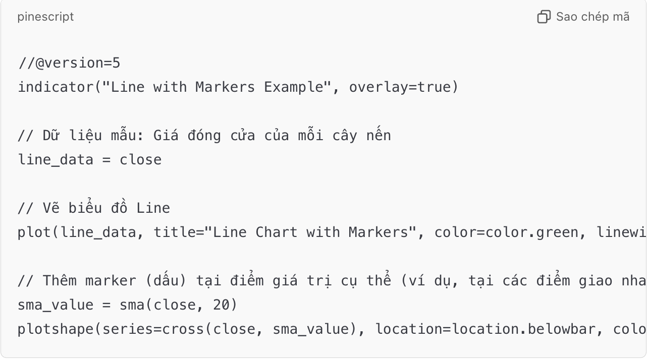 Bằng cách sử dụng Pine Script trong TradingView, bạn có thể dễ dàng tạo và tuỳ chỉnh các biểu đồ Line, Line with Markers và Step Line để phân tích dữ liệu và thị trường một cách hiệu quả. Các hàm plot() và plotshape() cho phép bạn vẽ đường và thêm các điểm dữ liệu cụ thể (markers) theo nhu cầu.